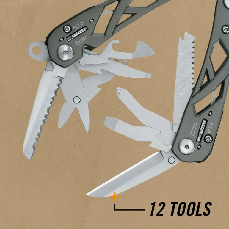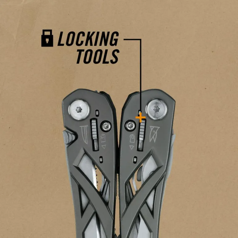 Monitoimityökalu, perhosmalli, jousikuormitteinen. Varustettu pihdeillä, leikkurilla, sileällä ja tasaisella terällä, sahalla, pienellä ja keskisuurella uraruuvitaltalla, ristipääruuvitaltalla, tölkinavaajalla, pullonavaajalla ja saksilla.