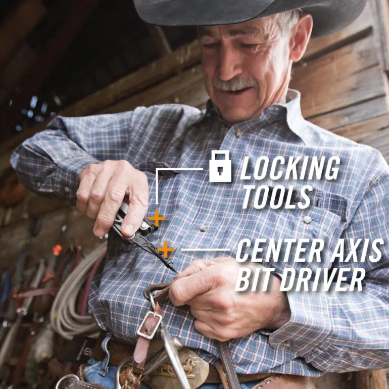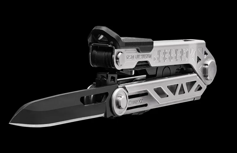 Monitoimityökalu, jossa on pyörivä leikkuuterä, joka on myös vaihdettavissa. Monitoimityökalu on varustettu terävillä jousikuormitteisilla pihdeillä, keskitetyllä ruuvitaltalla, jossa on vaihdettava kärki, pullonavaajalla, 8cm:n terällä ja viilalla jne.