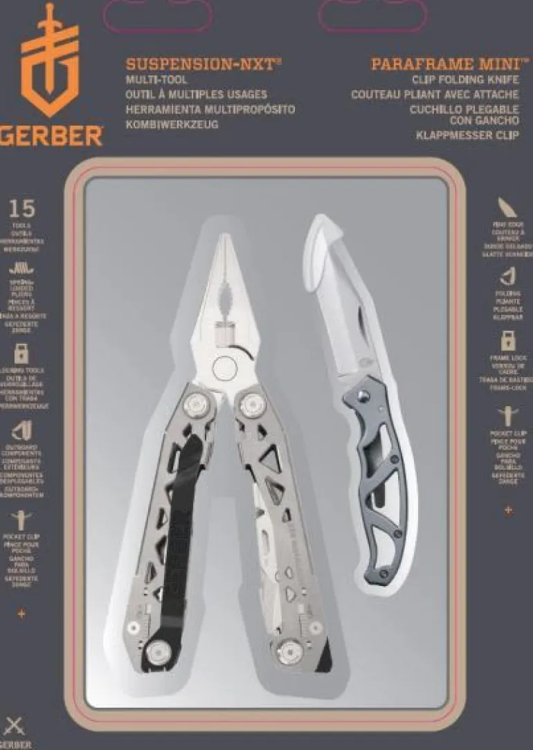 Monitoimityökalusetti taskuveitsellä (metallinen lahjapakkaus), joka sisältää SUSPENSION-NXT® -monitoimityökalun 15 toiminnolla ja taitettavan PARAFRAME MINI® -taskuveitsen lukittavalla sileällä terällä ja vyöklipsillä. Veitsi voidaan avata yhdellä kädellä. Monitoimityökalun toiminnot: pihdit, leikkurit, sileä ja sahalaitainen veitsenterä, sakset, ristipääruuvitaltta, uraruuvitaltat S-M-L, säilyketölkinavaaja, pullonavaaja, naskali, viila, viivain ja johdonkuorija.