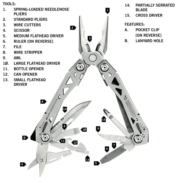 Yleismonitoimityökalu erilaisiin käyttötarkoituksiin, yhtä toimiva kotona kuin telttaretkellä. 15 toimintoa, muun muassa pihdit, sakset, pullonavaaja, naskali, viivotin, viila sekä risti- ja tasapääruuvitaltat. Lujatekoinen rakenne, jousikuormitteinen kahva ja osittain sahalaitainen/suora terä (terän pituus: 5,7 cm). Voidaan ripustaa vyölle tai pitää taskussa kompaktin koon ja käytännöllisen pidikkeen ansiosta.