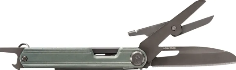 Ohut runko, jossa 2 1/2 tuuman veitsi, pieni sakset ja pullonavaaja. Helppo kiinnitys integroidulla avaimenperällä.