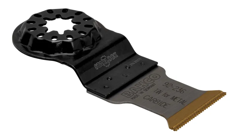 Bahco 92-236 karbidikärkinen monitoimiterä (bimetalliterä) TiN-pinnoitteella vaativaan metallin sahaukseen. Upotussahanterä, joka on erittäin kulutuskestävä. Kestää 100 % kauemmin kuin pinnoittamaton karbidikärkinen sahanterä ja 30 kertaa pidempään kuin HSS-sahanterä. Sopii vaativille materiaaleille, kuten rautapitoisille metalleille, ruostumattomalle teräkselle, kupariputkille, karkaistuille ruuveille (Spax) ja kovateräksisille koneruuveille. Erinomainen kulumiskestävyys. Soveltuu myös kuluttaville materiaaleille, tiilille, laastille, kuitusementille, hiili- ja lasikuituvahvisteiselle muoville. Starlock-kiinnitys, joka sopii useimmille monitoimityökaluille.