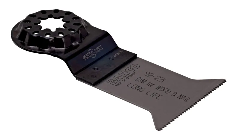 Bahco 92-228 vakioterä naulaisen puun sahaukseen, monitoimiterä. Kestävä BiM-sahanterä, jossa hammastus puulle. Kaikenlaisen puun ja myös naulaisen puun sahaukseen. Soveltuu kaikille puu-, kipsilevy- ja muovimateriaaleille. Erittäin kestävä, myös naulaisen puun leikkaamiseen (n. 4 mm paksuuteen saakka). Työkalun käyttöikä ensiluokkainen, erinomainen sahauslaatu ja nopeus. Leveä muoto mahdollistaa parhaan sahaustehon ja pitkän suoran sahauksen. Kavennettu terä takaa hyvän leikkausnopeuden ja purun poiston. Starlock -kiinnitys, joka sopii useimmille monitoimikoneille.