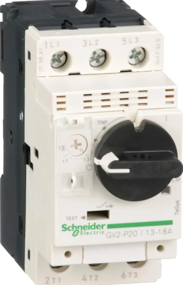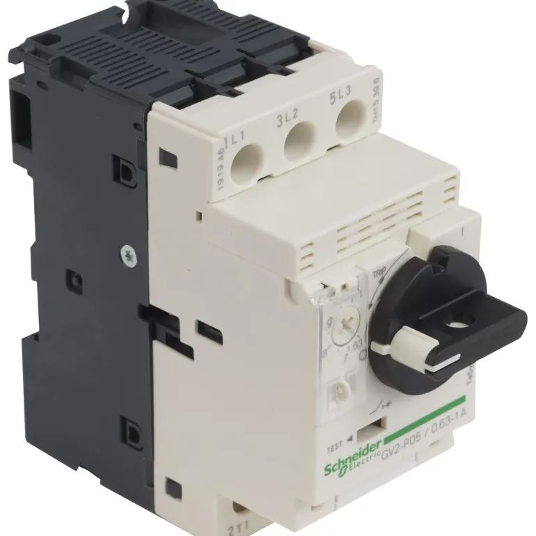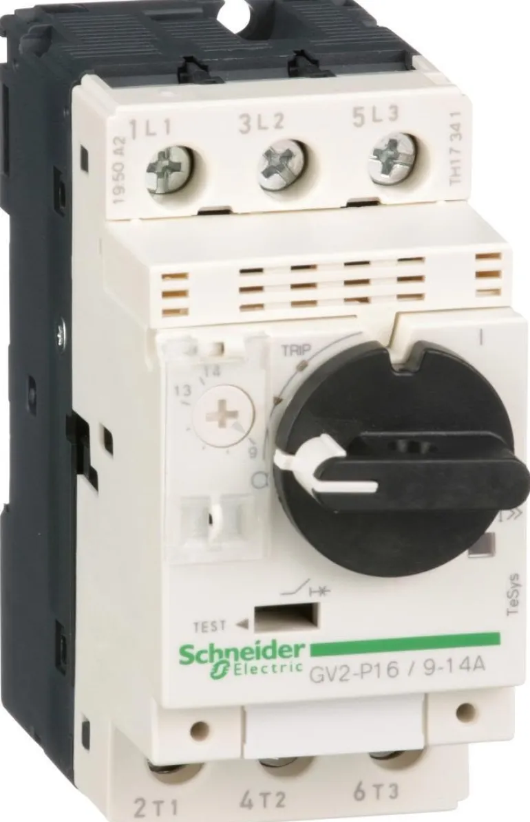 Schneider Electric GV2P10 -moottorin suojakytkin lämpömagneettisella laukaisulla. Varustettu vaihevikasuojalla. Jos oikosulkuvirta ei ylitä katkaisukapasiteettia, sulaketta ei tarvita. Pikakiinnitys asennettavaksi DIN-kiskoihin tai koteloihin. Tilasta riippumaton. 3-napainen lämpö- ja magneettisuoja, joka on erityisesti suunniteltu ohjaamaan ja suojaamaan moottoreita IEC 947-2 ja IEC 947-4-1 -standardien mukaisesti. Magneettisuojassa (oikosulkusuojaus) on kiinteä laukaisutaso, joka on noin 13-kertainen (± 20 %) lämpölaukaisun maksimivirtaan verrattuna.
