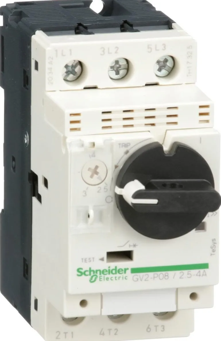 Schneider Electric GV2P10 -moottorin suojakytkin lämpömagneettisella laukaisulla. Varustettu vaihevikasuojalla.