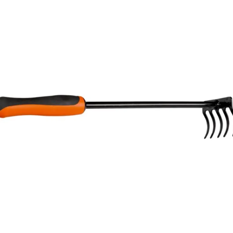 5-piikkinen möyhennysharava, erikoispitkä varsi takaa paremman ulottuvuuden. Mukava kaksikomponenttimateriaalista valmistettu kahva, jossa liukumaton pinta, epoksimaalattu pinta suojaa ruosteelta ja estää multaa kiinnittymästä piikkeihin.