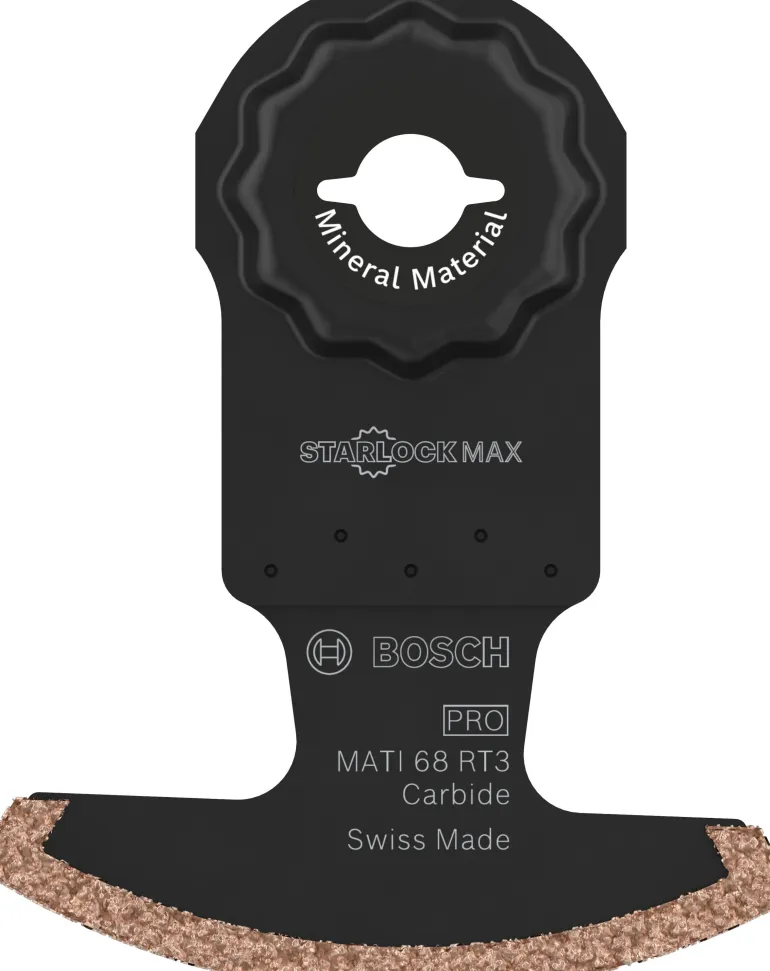 Bosch PRO MATI 68 RT3 monitoimityökalun terässä on käytetty kestäviä kovametallirakeita sen varmistamiseen, että se on kestävä ja tehokas, kun työmateriaalit ovat kuluttavia. Sen ainutlaatuinen D-muoto mahdollistaa työskentelyn suoraan kulmissa tai esineiden, kuten kahvojen, ympärille kaakeloidussa kylpyhuoneen seinässä. Soveltuu materiaaleille laasti ja kevytbetoni.