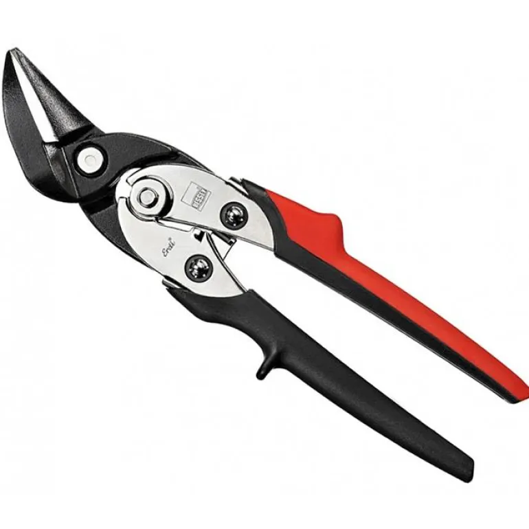 Muotosakset vasemmanpuoleiseen leikkaukseen. Saksissa on ergonomisesti muotoillut kahvat, viistopää parantaa ulottuvuutta. Leikkaa 1,4 mm ruostumatonta terästä.
