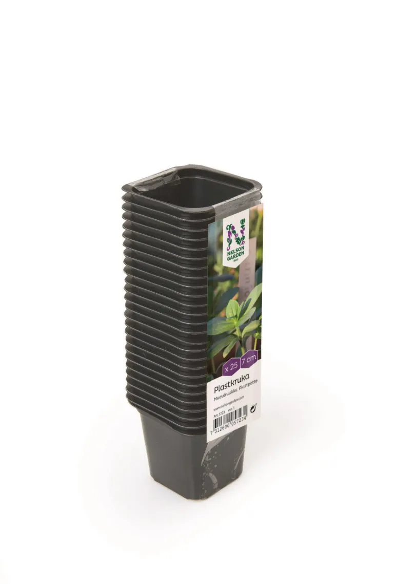 Neliskulmainen musta muoviruukku esikasvatukseen ja taimien koulintaan. Sopii pienoiskasvihuoneeseen ja taimikasvatuslaatikkoon. Vahvaa materiaalia, uudelleen käytettävä. Valmistettu polypropeenista (PP). 25 kpl/pakkaus.
