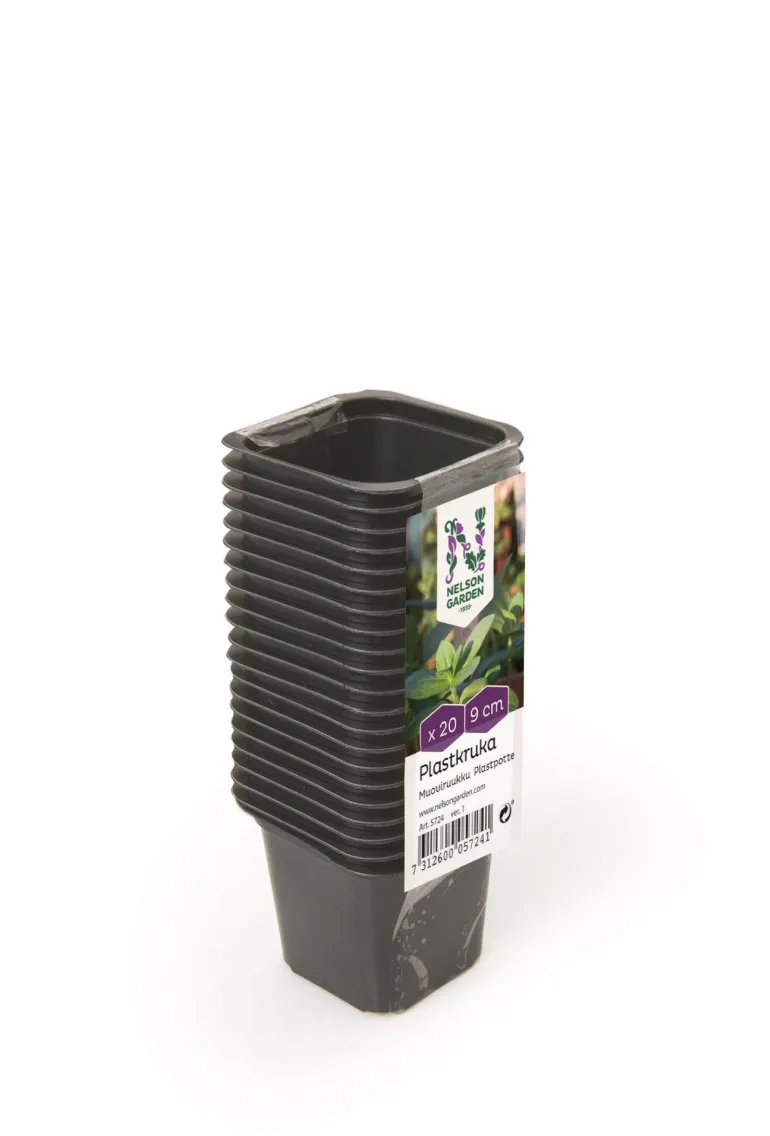 Neliskulmainen musta muoviruukku esikasvatukseen ja taimien koulintaan. Sopii pienoiskasvihuoneeseen ja taimikasvatuslaatikkoon.