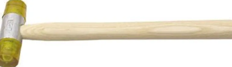 Kuparivasara vaihdettavalla iskupinnalla. Vasarassa on keltainen iskupää adusoitua materiaalia, varsi hikkoripuuta.