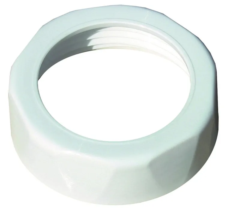 Vesilukon ja liittimien mutteri. Malli on valmistettu valkoisesta PP-muovista, ja siinä on sisäkierre.