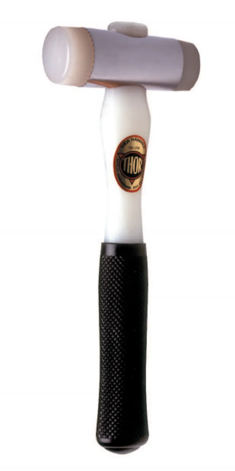 Nailonkärkinen vasara vaihdettavilla valkoisilla nailon-iskupinnoilla (kierretapillinen). Iskupää terästä.