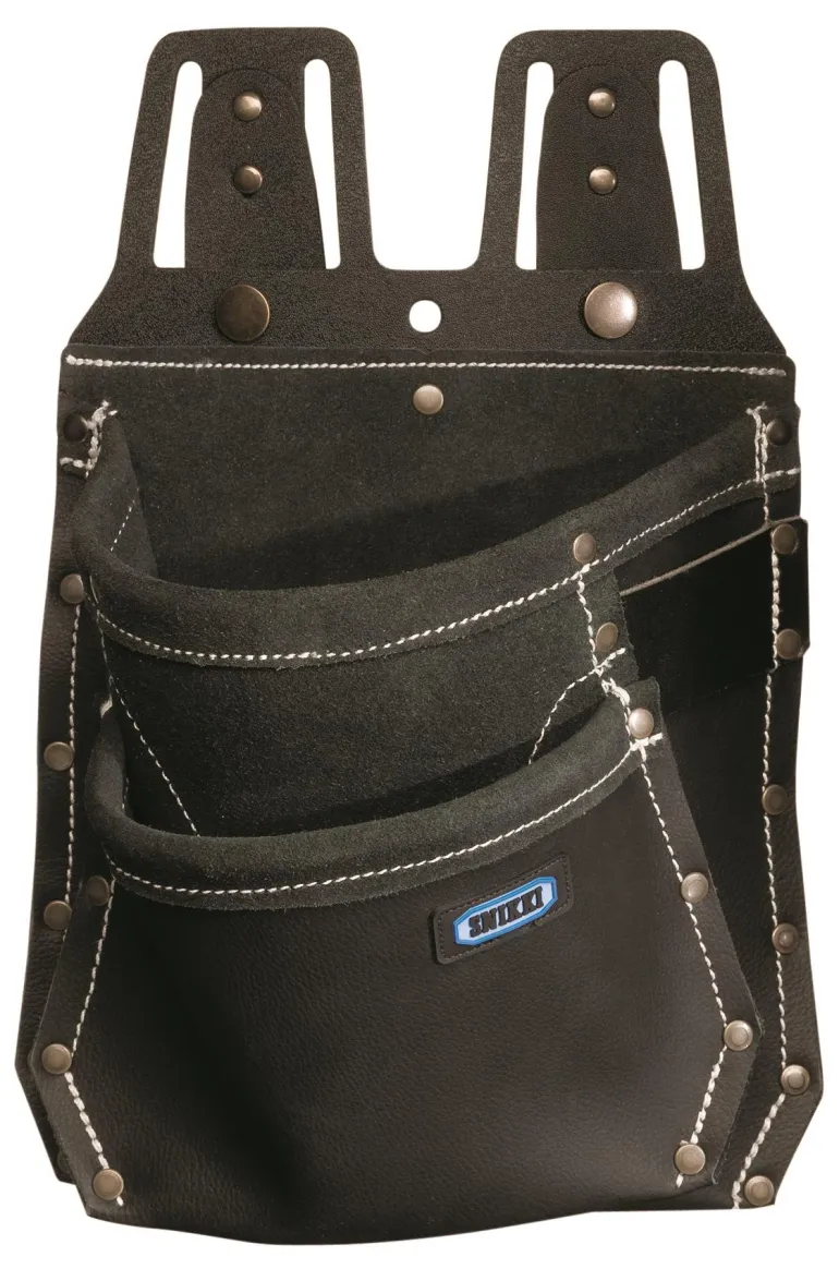 Materiaalitasku, jossa kaksi taskua ruuveille ja nauloille, puukkopidike ja Quick-grip-kiinnike. Materiaalitaskussa on niittivahvistus, se on vettähylkivä ja valmistettu Ruotsissa.