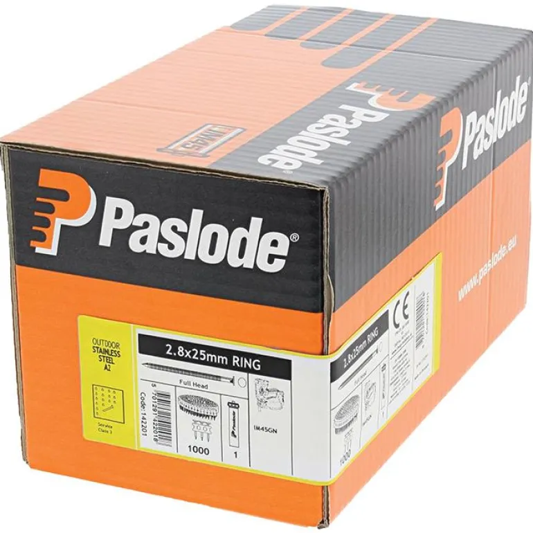 Yhdistelmäpakkaus sisältää sidottuja, ruostumattomia A2-nauloja, 2,8 x 25 mm ja yhden kaasupatruunan Paslode IM45 GN -naulainta varten. Täysin pyöreäkantaiset naulat tarjoavat optimaalisen suorituskyvyn pakkausten naulaamiseen ja kipsilevyn naulaamiseen puuhun.
