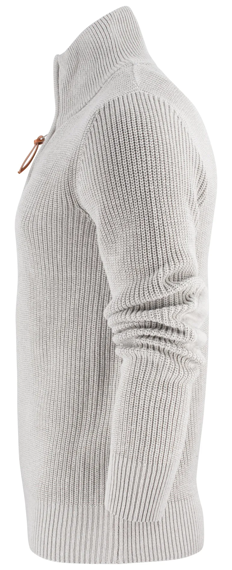 James Harvest Flatwillow on puolivetoketjullinen neulepusero korkealla kauluksella. Resori kauluksessa, hihansuissa ja helmassa. Lisäksi kyynärpäissä vahvikkeet sekä keinonahkainen vetoketjun vedin.
