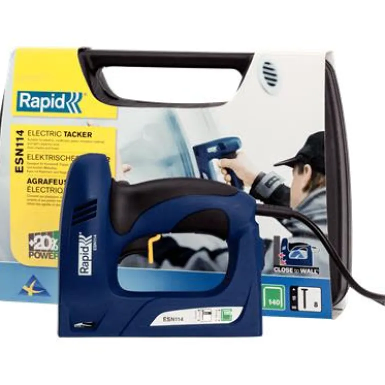Rapid ESN114 on helppokäyttöinen ja tehokas sähkökäyttöinen niittipistooli vaativiin kodin projekteihin. Kova suorituskyky ja kestävyys auttavat monipuolisessa käytössä. Lyhyt etuosa helpottaa kulmiin pääsyä. Rapid ESN114 sopii säännöllisiin kiinnitystöihin, esim. ohuen puun ja masoniitin tai kartonkien, muovien, kevytpeitteiden tai pahvin kiinnittämiseen kohteissa, joissa hakasilta tarvitaan suurta kiinnityskykyä.