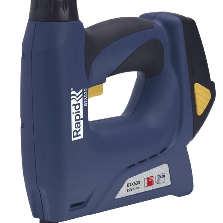 Rapid BTX530 on akkukäyttöinen 7,2 V:n niittipistooli töihin, joissa tarvitaan vapaata liikkuvuutta. Suuri akkuteho ja lyhyt latausaika takaavat pitkän työskentelyjakson ja keskeytymättömän, joustavan käytön. Ergonominen kumipäällysteinen kahva takaa täydellisen tasapainon ja tarkkuuden Rapid BTX530 soveltuu jokapäiväiseen käyttöön, kuten huonekalujen uudelleenverhoiluun, tekstiilien koristeluun ja mattojen, nahan sekä ohuen puumateriaalin kiinnitykseen.