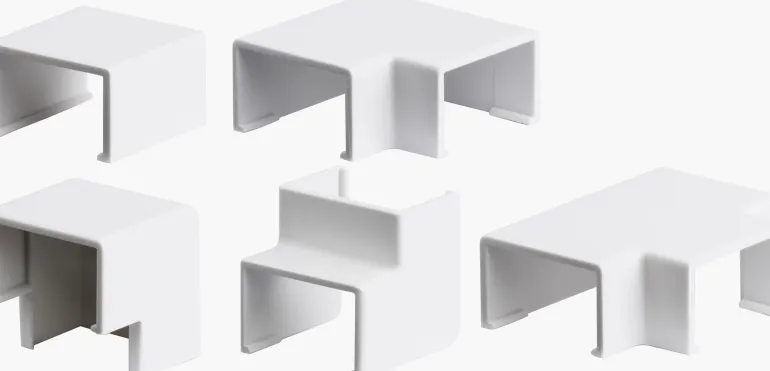 Sarja, jossa on Plasfix-kaapelikanavien liitos- ja kulmakappaleet. Pakkaus sisältää 7 erilaista mallia.