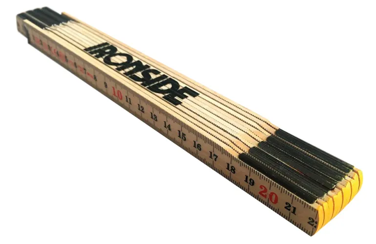 2 m pitkä asteikko 10 osassa, metrinen asteikko molemmin puolin molemmista päistä alkaen. Nivelsaranat on valmistettu teräksestä.