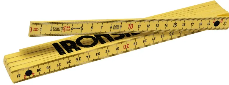 Lasikuituvahvisteinen keltainen muovi. Asteikko molemmilla puolilla, alkaa kummastakin päästä. Käänteinen asteikko molemmista suunnista lyhyiden mittojen mittauksen helpottamiseksi. Metrinen asteikko. 10 osaa, pituus 2 m. Toleranssi EU-tarkkuusnormin III mukaan.