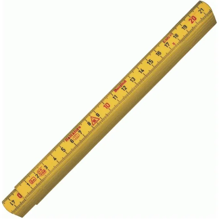 1 metrin pituinen taittomitta. Valmistettu lasikuituvahvisteisesta muovista, musta asteikko molemmilla puolilla ja punaiset desimetrinumerot.