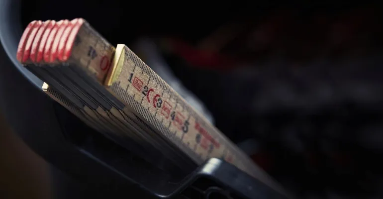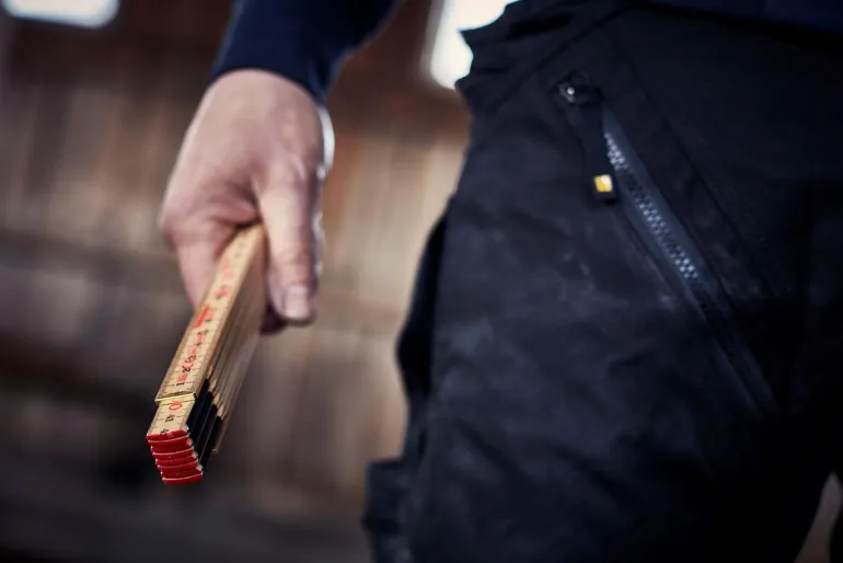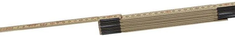 Nivelmitta 2 m, valmistettu hieskoivusta, nivelet ruotsalaista terästä. Ohuttikkuinen ja kätevä mitta. Musta metrinen asteikko molemmilla puolilla, punaiset desimaalinumerot.