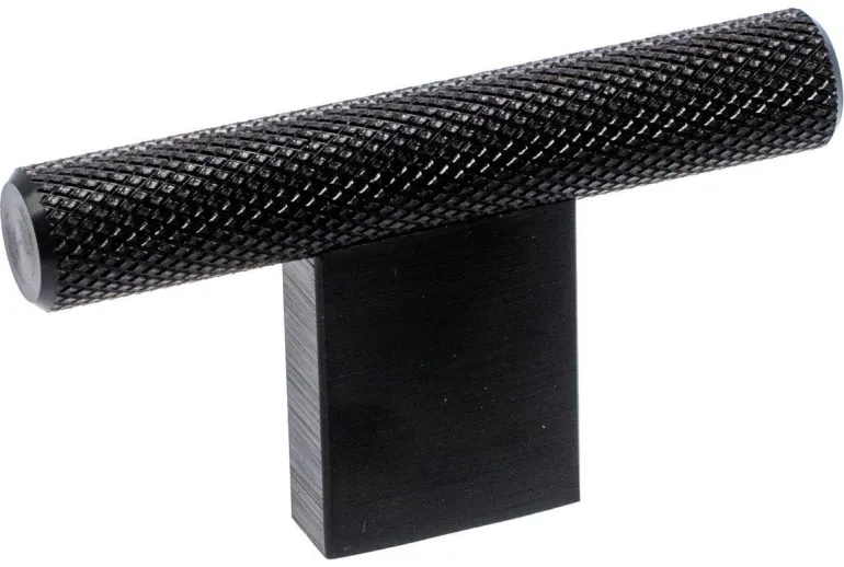 Musta nuppi, jonka hammastettu pinta tekee siitä erityisen mukavasti käteen sopivan. Voidaan käyttää myös ripustuskoukkuna.
