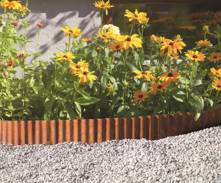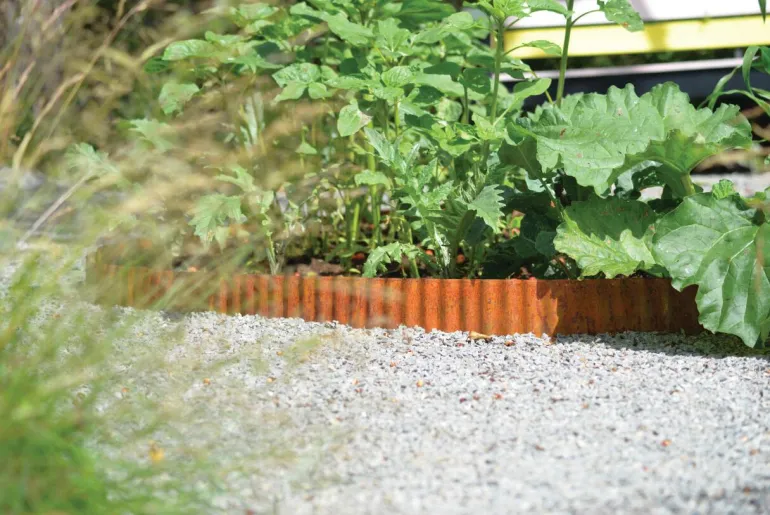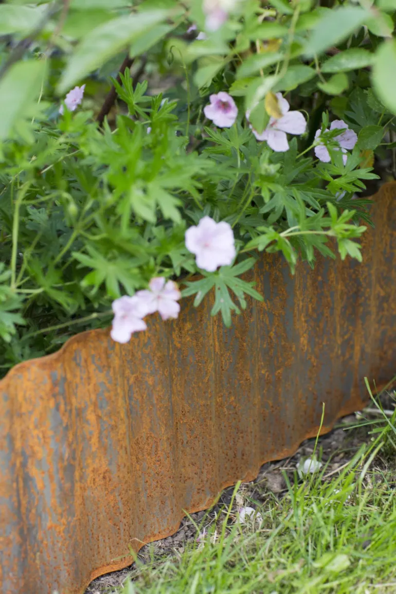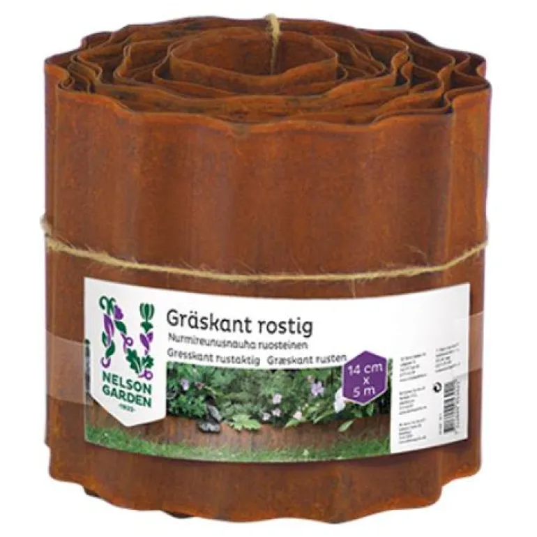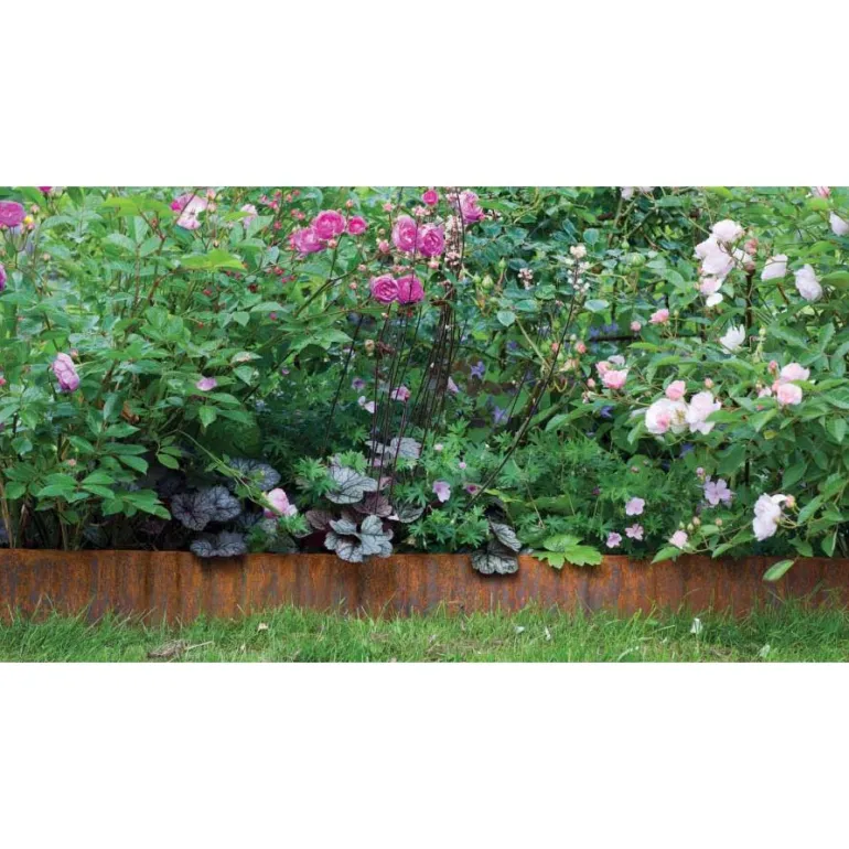 Metallinen, ruostepintainen nurmireunus. Asetetaan nurmikon ja kukkapenkin väliin, jotta ruoho ei leviä kukkapenkkiin. Käsitelty värjäämisen estämiseksi. Käytä suoriin ja muotoiltuihin alueisiin.