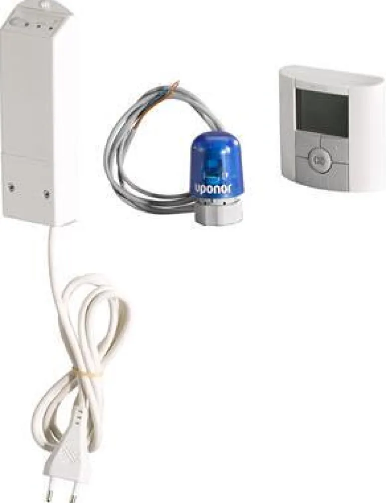Ohjaussarja Uponor Push 12- ja Fluvia Push-12 -pumppuryhmille. Sisältää 230 V -toimilaitteen, vastaanotinyksikön, johon on esiasennettu verkkovirtaliitäntä ja langattoman huonetermostaatin (sis. 2 AAA-paristoa).