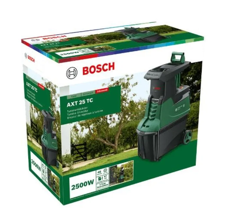 Suuren kokoojasäiliön tilavuus on 53 litraa, mikä pidentää tyhjennysvälejä. Silputut leikkuujätteet vievät vähemmän tilaa biojäteastiassa ja niistä voi tehdä erinomaista kompostia tai kukkapenkkien katemateriaalia. Helppoa ja kompaktia säilytystä varten syöttötorven voi sijoittaa kätevästi kokoojasäiliöön, jolloin silppuri on vain 67 cm:n korkuinen. Ainutlaatuinen Bosch Turbine Cut Technology on ylivertainen leikkuujärjestelmä, joka estää tukokset. Partaveitsenterävät turbiiniterät silppuavat oksat ja risut tehokkaasti; silppujäte poistuu nopeasti ja helposti pois avoimen kartiomuodon ansiosta.