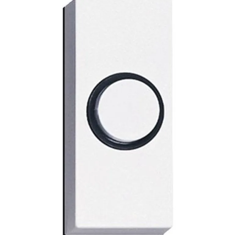 Valkoinen muovinen ovikellopainike, jossa piilotetut kiinnitysruuvit. Mitat 55 x 24 x 19 mm (K x L x S).