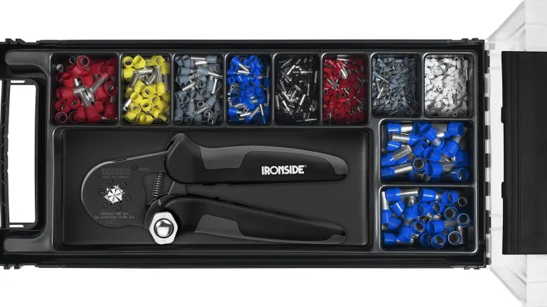 Ironside 103066 on pääteholkin puristinsarja, joka sisältää puristuspihdit automaattisella itsesäätymisellä sekä 850 kpl päätyholkkeja kuusikulmapuristusta varten. Kapasiteetti: 0,08-16 mm² (AWG 6) ja kaksoispäätyholkit jopa 2 x 10 mm² (AWG 2 x 8).