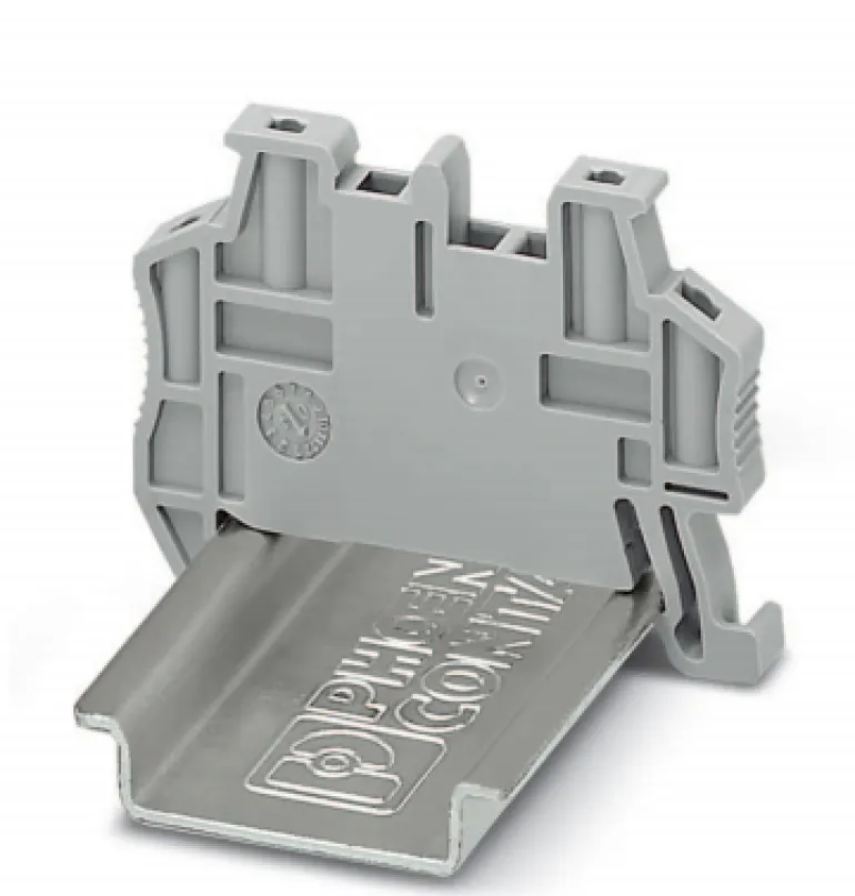 Kiskon harmaa päätytuki. Ei tarvitse ruuvata kiinni 35 mm:n kiskoon.