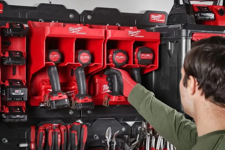 Milwaukee 4932480712 PACKOUT™-akkuväänninteline, joka säilöö maks. 2 kpl porakoneita, mutterinvääntimiä ja muita akkutyökaluja. Helppo ja nopea työkalujen käyttöönotto sekä turvallinen ja helppo kiinnitys napsautus- ja lukitusmekanismilla.