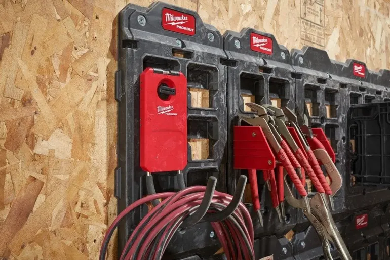 Milwaukee 4932480621 PACKOUT™-kiinnitysalusta useilla liitäntämahdollisuuksilla. Kiinnitysalustalla voit hyödyntää PACKOUT™-sarjan osia kiinteään varastointiin.