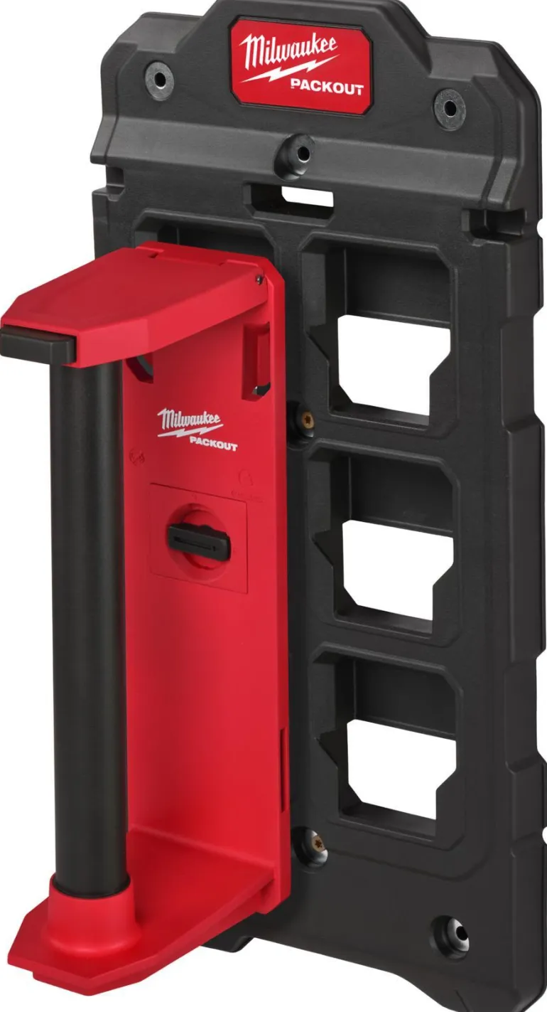 Milwaukee 4932480707 PACKOUT™-paperiteline paperi- ja teippirullille. Turvallinen ja helppo kiinnitys napsautus- ja lukitusmekanismilla.