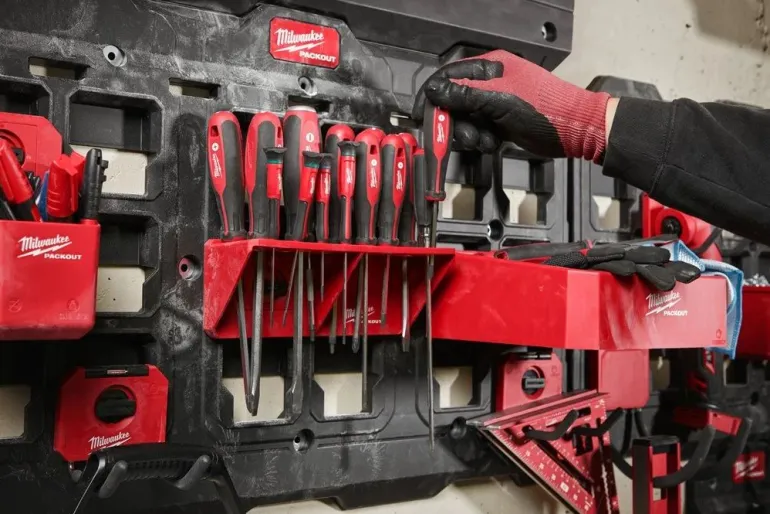 Milwaukee 4932480711 PACKOUT™-ruuvimeisseliteline, joka helpottaa ja nopeuttaa työkalujen ja muiden tuotteiden käyttöönottoa. Turvallinen ja helppo kiinnitys napsautus- ja lukitusmekanismilla.