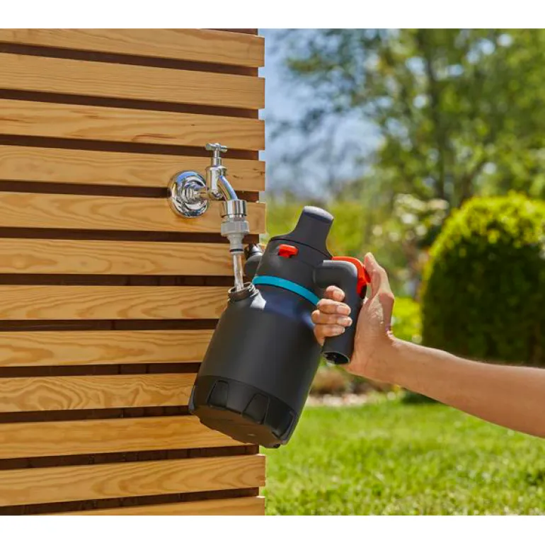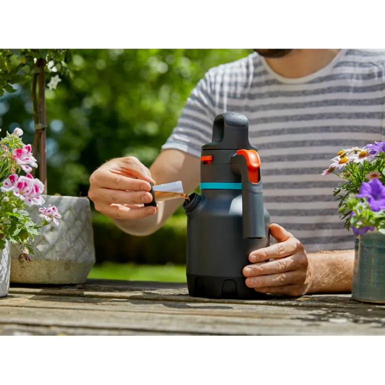 GARDENAn 1,25 litran paineruisku soveltuu erinomaisesti parveke- ja terassikasvien hoitamiseen. Säiliön toinen mitta-astialla varustettu täyttöaukko tarjoaa käytännöllisen 3-in-1-toiminnon. Täyttäminen, annostelu kuin tyhjentäminen onnistuu helposti ilman, että sinun tarvitsee irroittaa pumppuosaa ja kastella käsiäsi. Ennen käytön aloittamista ruiskun paine nostetaan ergonomisesti muotoillulla D-kahvalla pumppaamalla. Sen jälkeen sinun tarvitsee vain painaa kahvassa olevaa liipaisinta. Ruiskun 360°-toiminnon ansiosta se imee nestettä tehokkaasti asennosta riippumatta. Tämän seurauksena saat aina säännöllisen nestevirtauksen.