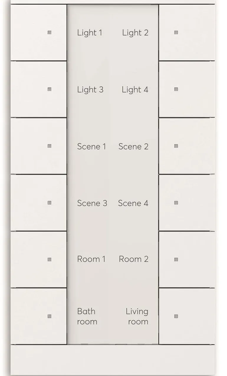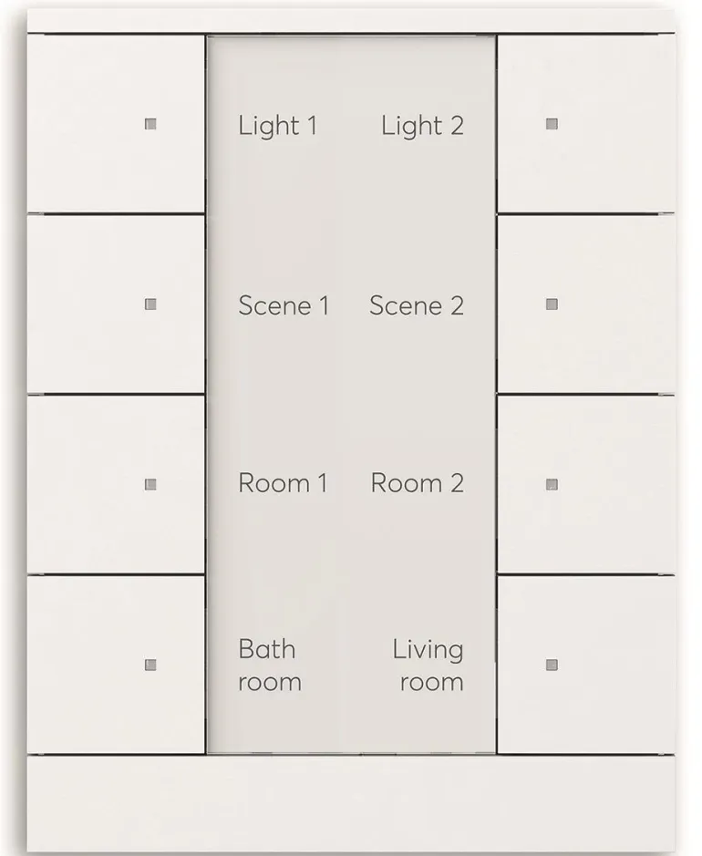 Vapaasti konfiguroitava monitoimiohjauselementti integroidulla KNX-väyläliitäntäyksiköllä ja merkintäalueella. Tuki KNX-toiminnoille innovatiivisella värikonseptilla (keltainen = valaistus, sininen = verhot, oranssi = RTC, magenta = tilanneohjaus ja valkoinen = neutraali / ei toimintoa) tai tavallisella punaisella/vihreällä valaistuksella.