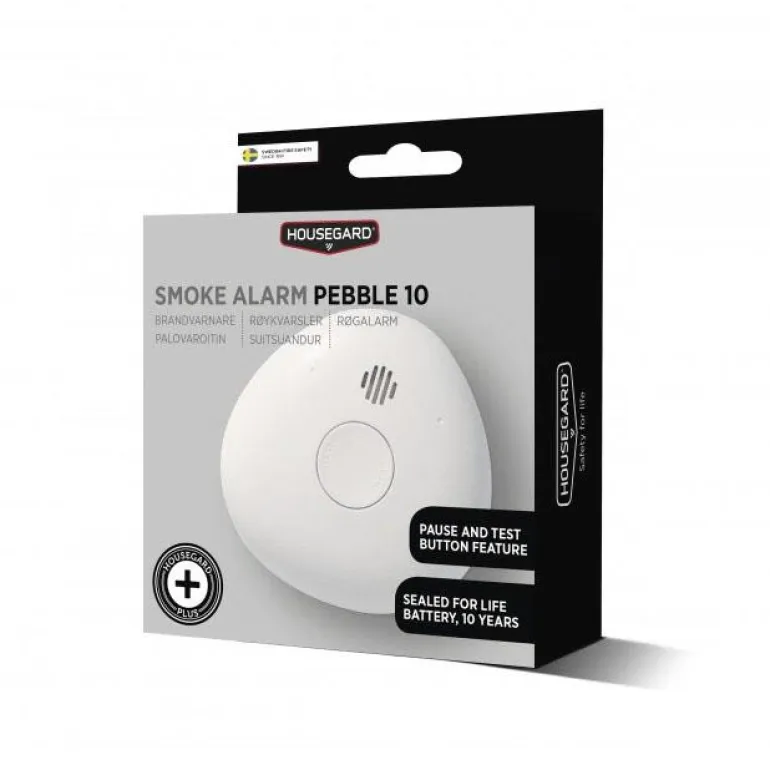 Housegard Pebble 10 on optinen palovaroitin, jonka käyttäjälähtöinen muotoilu tekee äänimerkin keskeyttämisestä ja testaamisesta sekä varoittimen huoltamisesta helppoa. Varoittimessa on kiinteä litiumparisto, joka kestää palovaroittimen 10 vuoden käyttöiän ajan. Se parantaa turvallisuutta, koska paristoa ei tarvitse muistaa vaihtaa. Pebble 10 -palovaroitin on tarkoitettu käytettäväksi veneessä, asuntovaunussa/asuntoautossa, asunnossa, kesämökissä ja toimistossa.