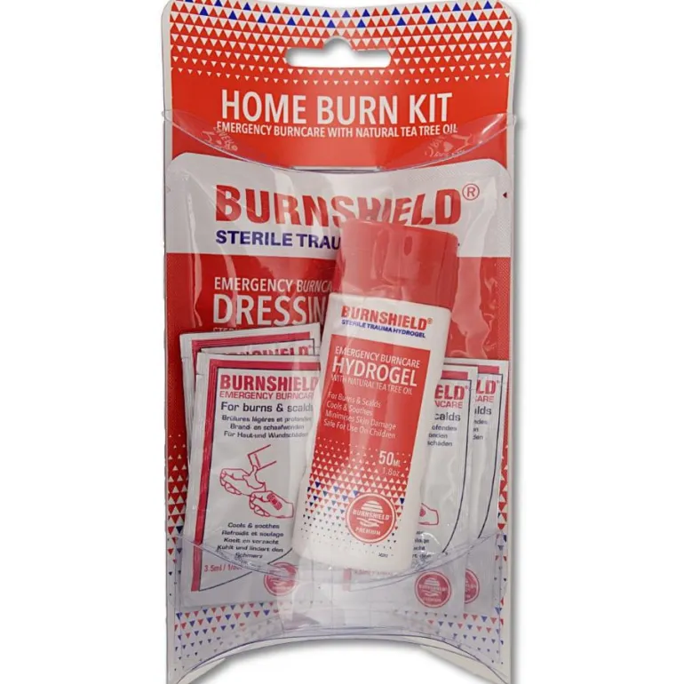 Burnshieldin ensiapupakkaus auttaa pienten palovammojen sattuessa. Pakkaus sisältää palovammasidettä, geeliä pienessä pullossa ja useita kertakäyttöpakkauksia.