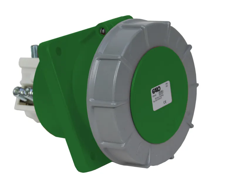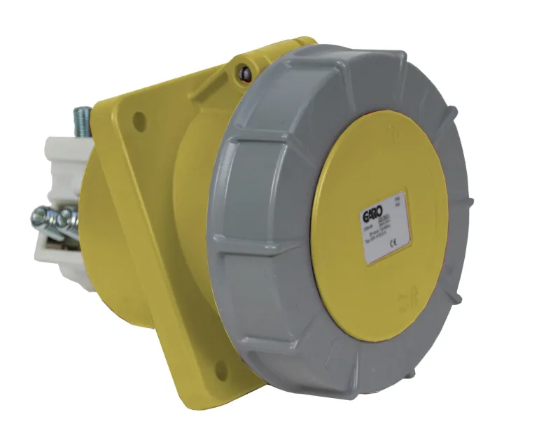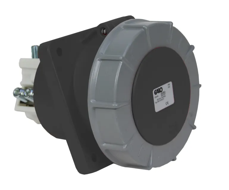 Vedenpitävä pistorasia paneeliasennukseen ohjaustapilla. Kiinnityslevyn mitat 114x114mmLiitettävä johtimen pinta-ala 16-50 mm² ja kiinteälle kaapelille 16-70 mm²Suojausluokka IP67.