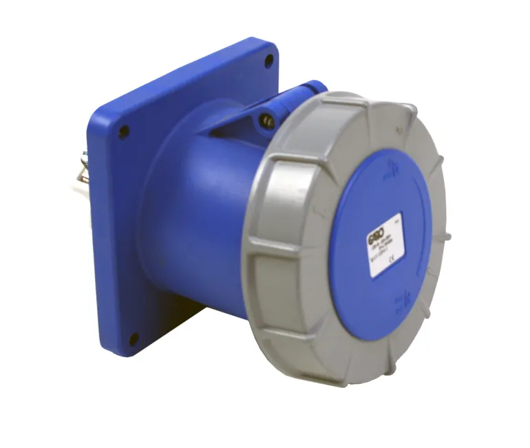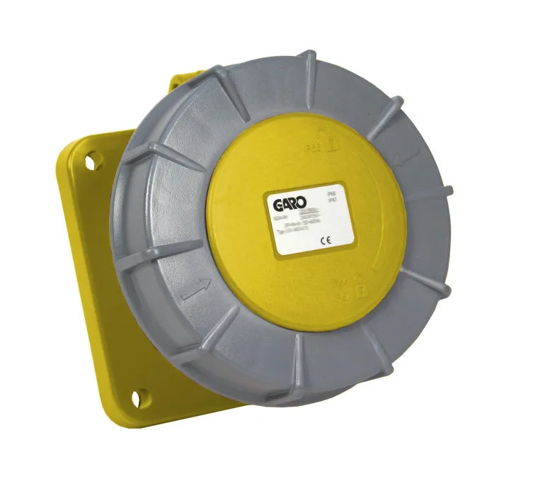 Vedenpitävä pistorasia paneeliasennukseen ja ohjaustapilla. Asennuslevyn mitat 120x120mm.