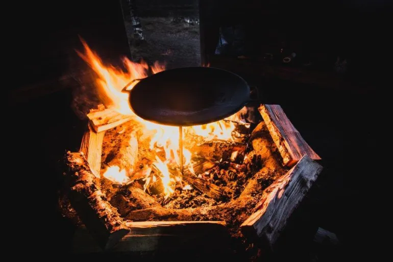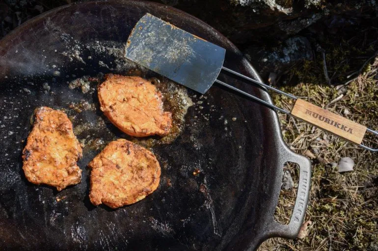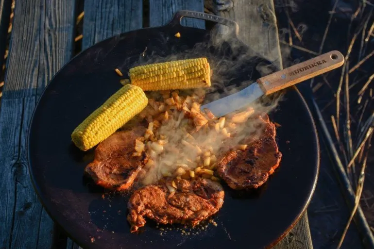 Kuumavalssatusta teräksestä valmistetussa pannussa on irrotettavat jalat. Sopii kaasupolttimen päälle, sähkögrilliin tai avotulelle.