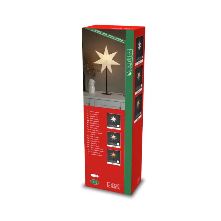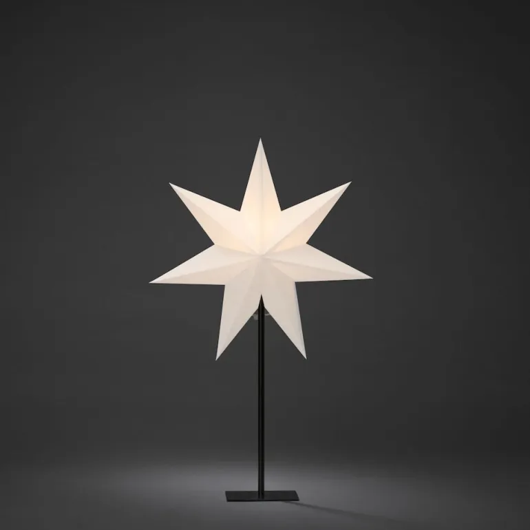 Konstsmide 1761-200 on valkoinen paperitähti 40×65 cm mustalla metallisella jalustalla. 230V/IP20.