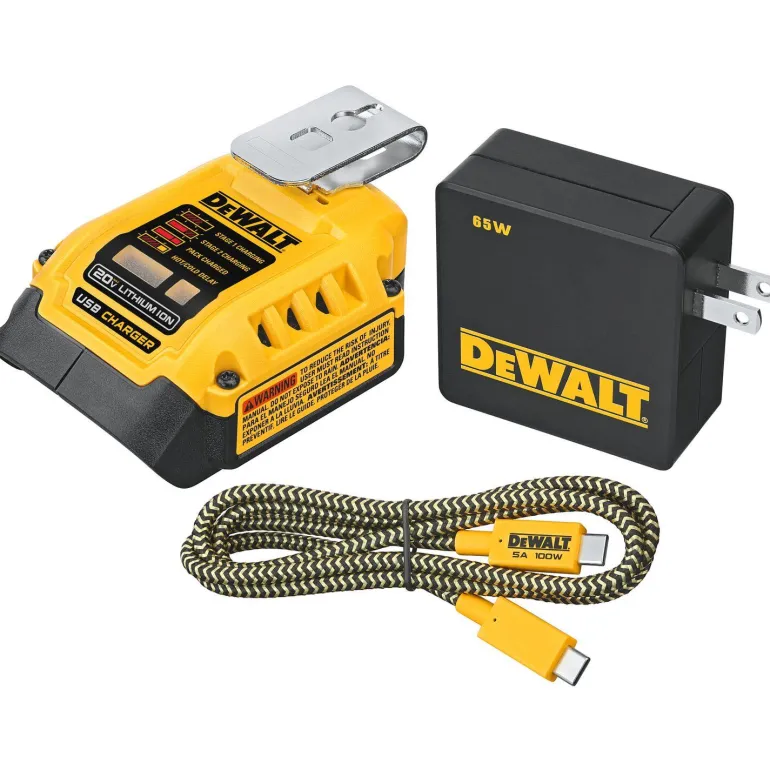18V USB -sovitin lataukseen ja virtalähteeksi; sen avulla voit muuntaa minkä tahansa 18V XR DEWALT -akun kannettavaksi laturiksi eri elektroniikkalaitteille, kuten puhelimille, tableteille, kannettaville tietokoneille, langattomille kaiuttimille/kuulokkeille ym. Kaksisuuntainen toiminto mahdollistaa sen käytön latauslaitteena 18V XR DEWALT -akkujen kanssa (5 A), kun käytetään mukana toimitettavaa kaapelia ja adapteria (muut kaapelit/sovittimet voivat hidastaa latausnopeutta). Loppukäyttäjä voi yhdistää laitteen auton USB-porttiin ja ladata DEWALT-akut liikkeellä ollessaan.