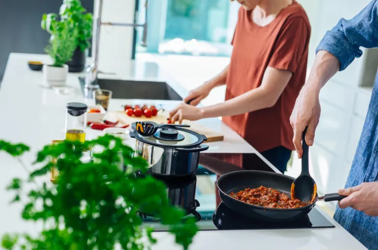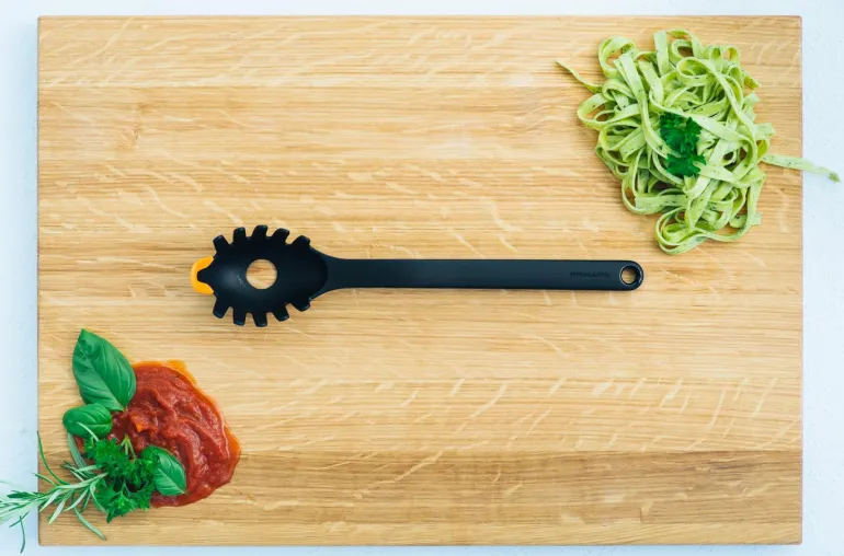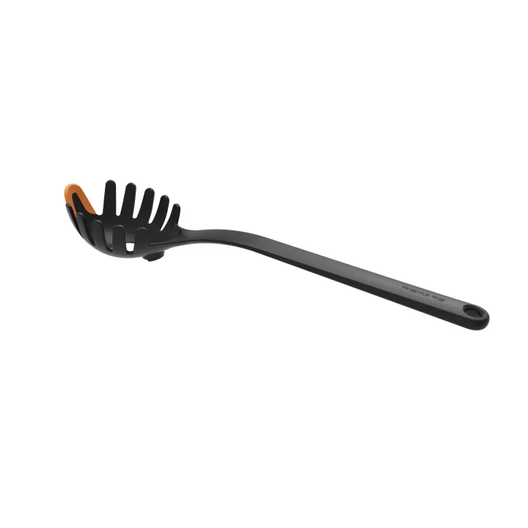 Silikonipäällysteinen kärki auttaa raapimaan kaikki pastat pois kattilasta, myös minkä tahansa kastikkeen. Integroitu spagettimittari. Konepesun kestävät.