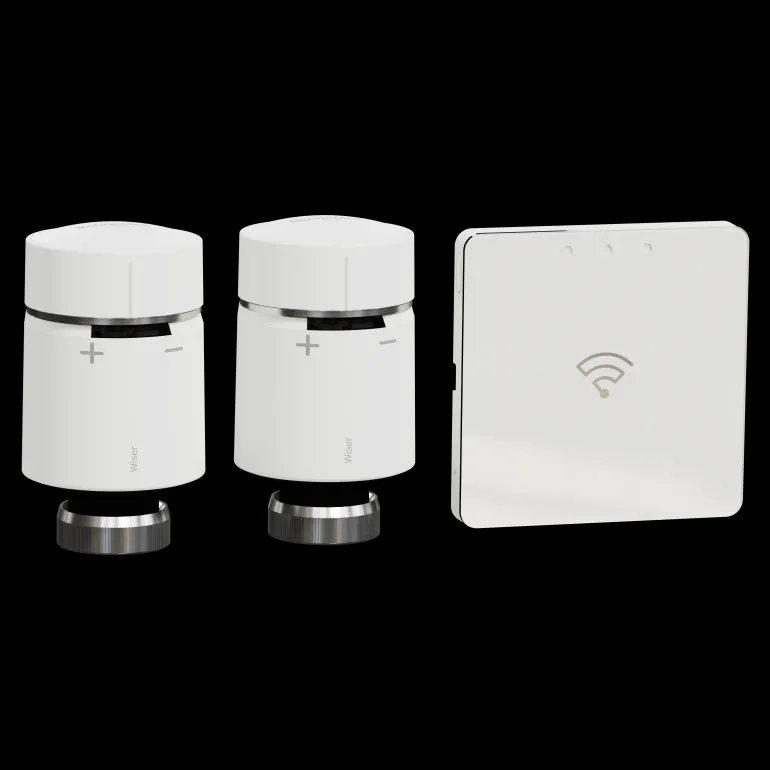 Schneider Electric CCTFR6906WA Wiser -aloituspakkaus, joka sisältää Wiser Gateway -keskusyksikön ja kaksi patteritermostaattia vesikiertoisten pattereiden lämmityksen ohjaukseen. Mahdollistaa aikataulutuksen ja lämpötilan hallinnan mobiililaitteellasi sovelluksen kautta.