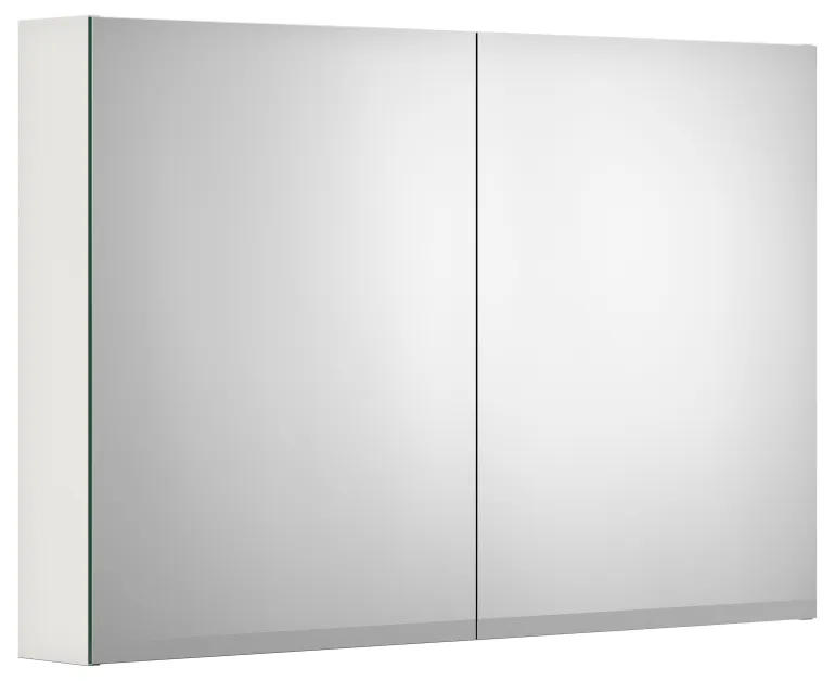 Valkoinen peilikaappi kahdella kaksipuolisella peiliovella Gustavsbergiltä, 100 cm. Alareunat on huurrettu, jotta peiliin ei jää rasvatahroja.
